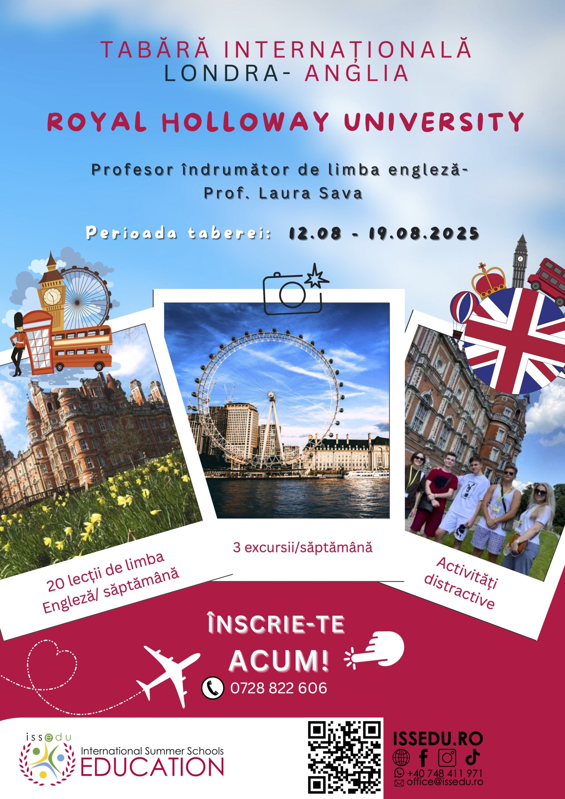 Adventure Camps, Noutăți Tabăra Marea Britanie, Londra, 2025. Posted by smart On 2 februarie 2025 Comentariile sunt închise pentru Tabăra Marea Britanie, Londra, 2025. Avem plăcerea să vă anunțăm că vara aceasta vom organiza o tabără în Marea Britanie! Înscrie-te la cea mai tare tabără a anului în Anglia, Royal Holloway University of London Campusul este situat nu departe de Londra, la numai 5 mile de Castelul Windsor. Te așteaptă cursuri de engleză, activități sportive și recreative, un campus internațional și multe excursii! Descarcă PDF Vizitează site-ul