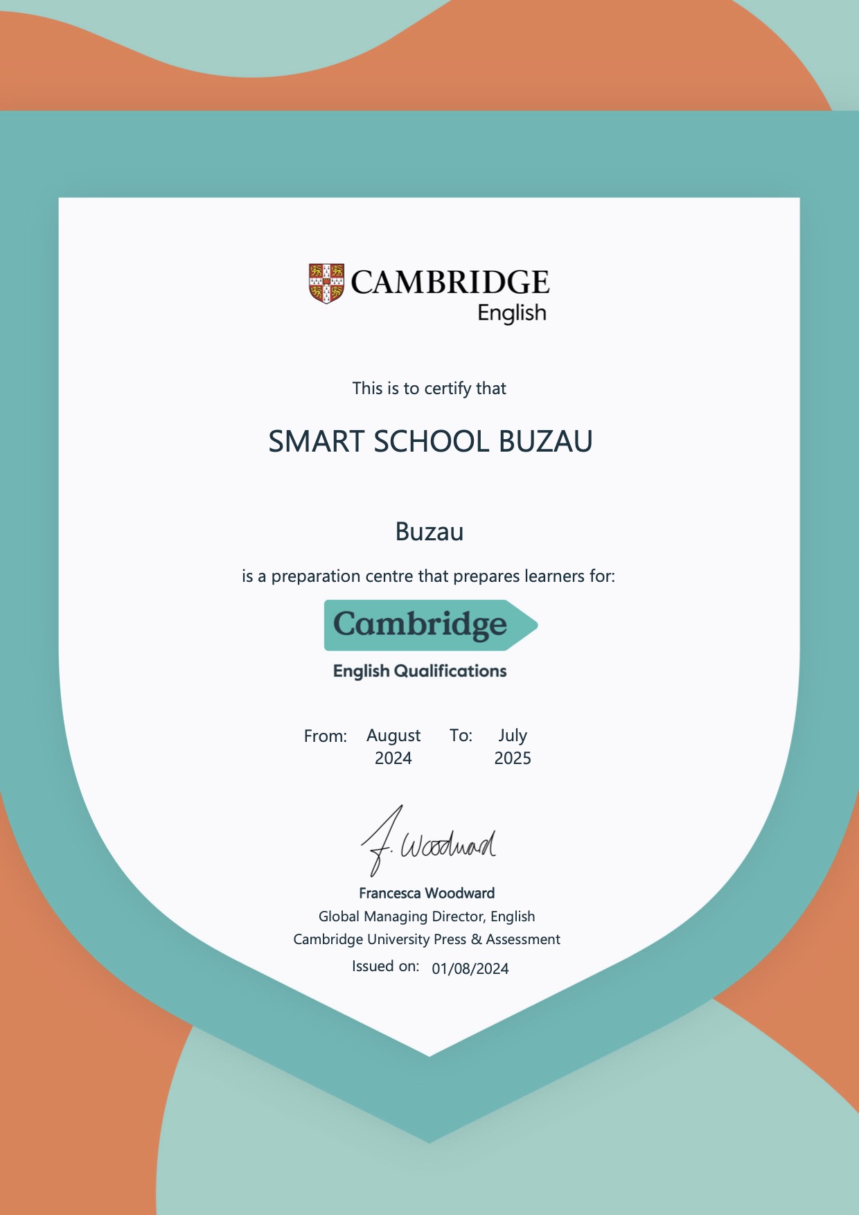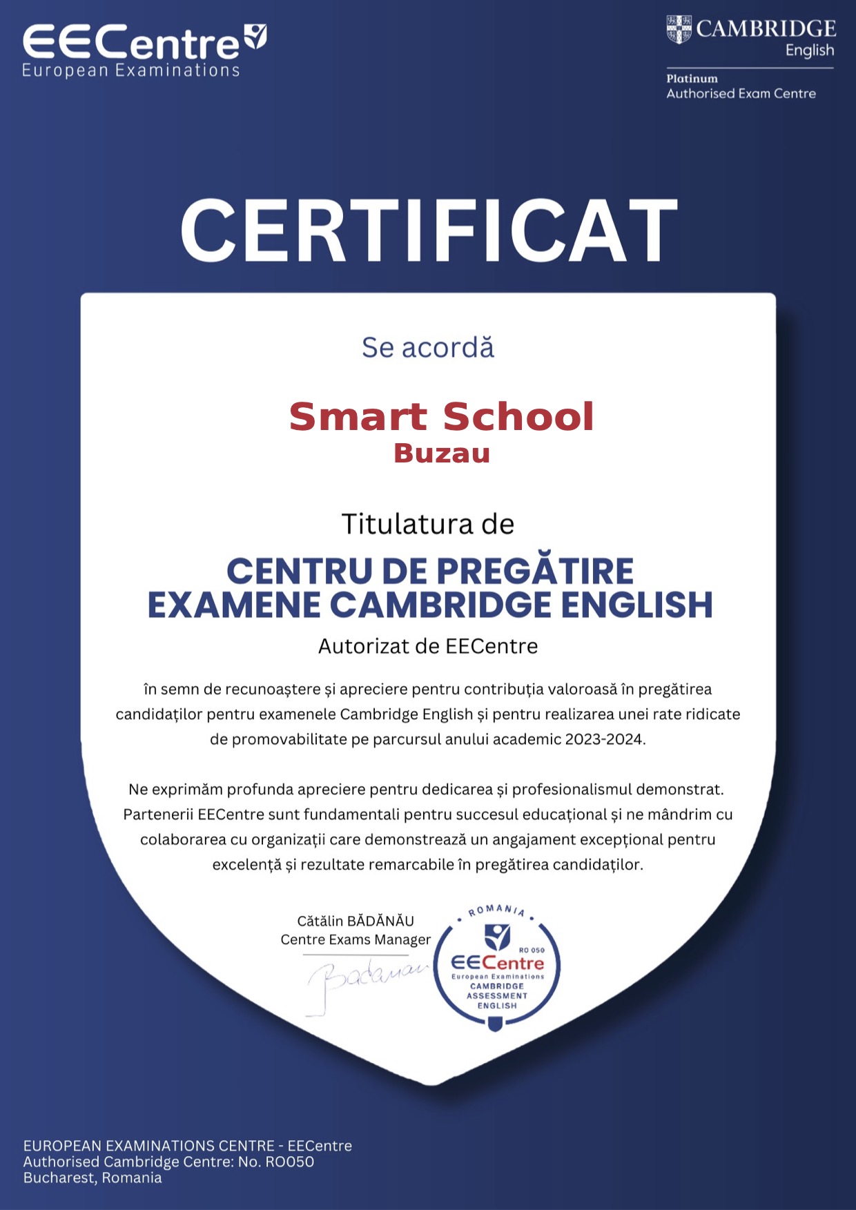 SMART SCHOOL este Centru de Pregătire CAMBRIDGE pentru limba engleză, iar parteneriatul dezvoltat cu EUROPEAN EXAMINATIONS CENTRE din București (EECentre) presupune organizarea de examene lingvistice cu recunoaștere internațională.