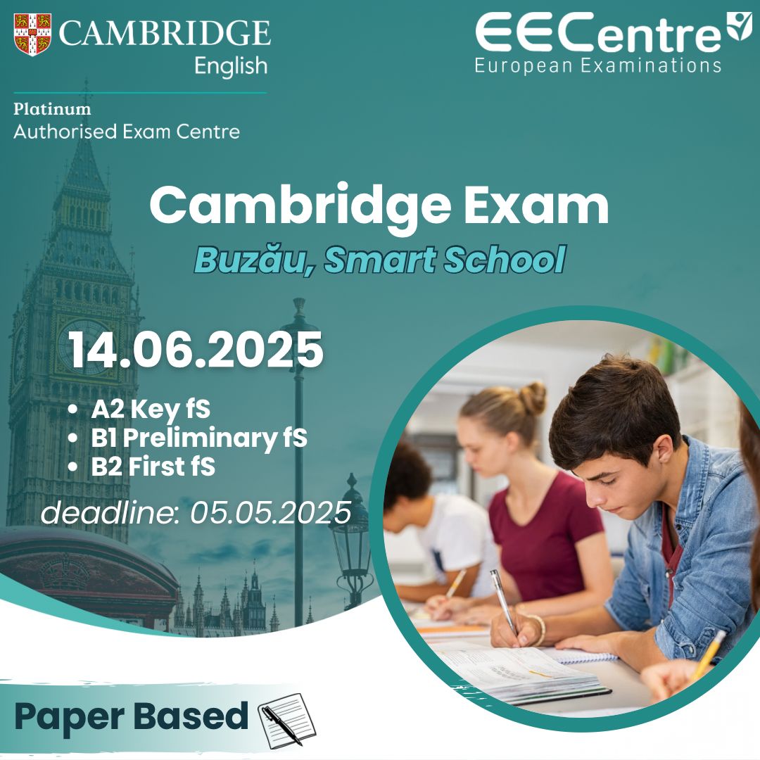 - La încheierea fiecărui an școlar (în luna iunie), Smart School organizează la sediul său din Buzău, sesiuni de examene Cambridge English în colaborare cu centrul de examinare EECentre.